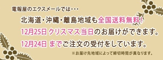 ギリギリになってしまったけどクリスマス当日にどうしても届けたいという方へ朗報です。電報屋のエクスメールでは12月24日までの受付で、12月25日当日の配達が可能です。(一部お届け地域を除く)