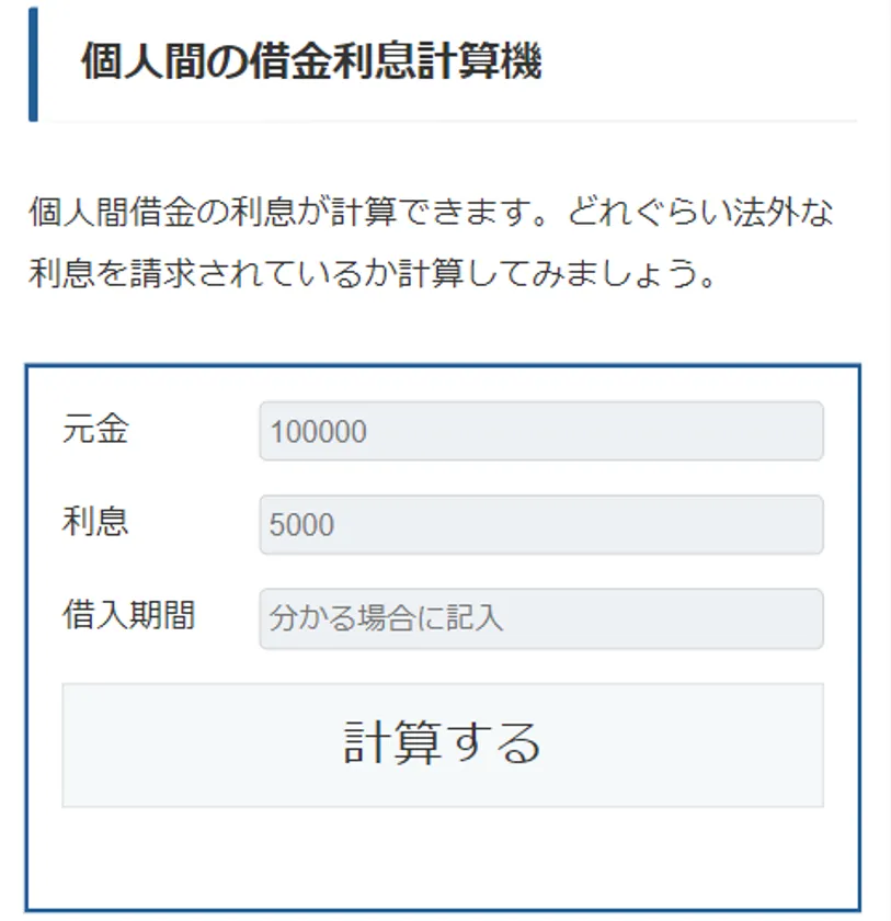 そこで当サイトでは、このような個人間融資の貸し借りの際の利息計算ができて、さらに法的に返済義務の有無が判別できる計算ツールを作成しました。