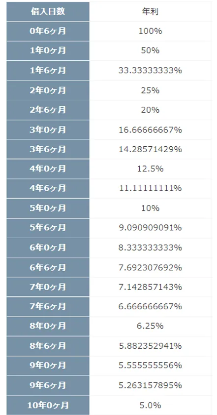 そうすると、下記のように借入期間を6ヶ月ごとと仮定して最大10年までの年利が表示されます。