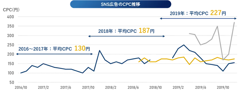 SNS広告のCPC(Cost Per Click)は、2016年には平均130円だったが、2019年には227円と74%も上昇。コロナ禍を経て、この傾向にはさらに拍車がかかっている。