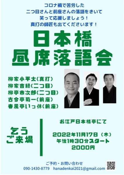 二つ目さんや前座さんの落語を聴いて笑って応援 『日本橋昼席落語会』9月~12月 出演者決定 カンフェティでチケット発売