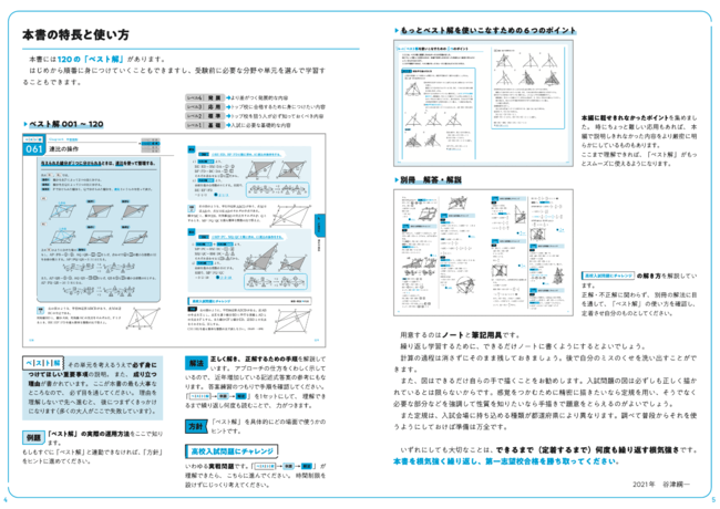 正しく解き、正解するための手順を解説しています。アプローチの仕方をくわしく示しているので、近年増加している記述式答案の参考にもなります。答案練習のつもりで手順を確認してください。「ベスト解→例題→解放」を1セットにして、理解できるまで繰り返し何度も読むことで、力がつきます。