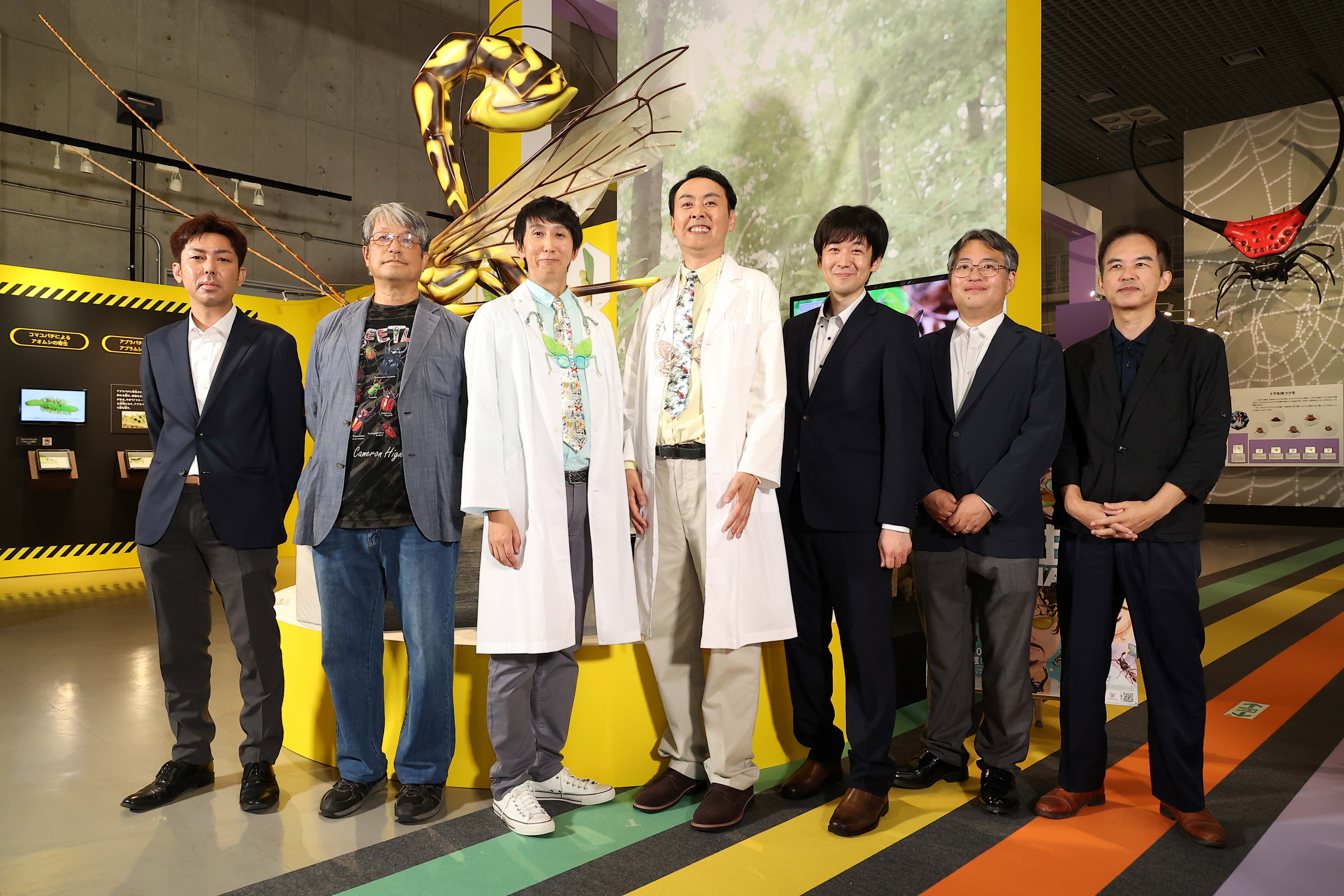 続いてアンガールズの二人が登場。展覧会のオリジナルグッズを身に着け、テンション高め! 今回の公式サポーターのオファーは、山根さんが番組で新種の昆虫(モトナリヒメコバネナガハネカクシ)を発見したことがきっかけだったそう。「だから今回、俺は山根のバーターなんです」(田中さん)、「人生初だよね」(山根さん)、「バーターされるってこんなに楽しいんだと思いました! 誰かのバーターって気がラクです」(田中さん)、「ムシで言えば、寄生虫だね。普段は俺が寄生虫ですけど(笑)」(山根さん)と掛け合いも弾みます。
