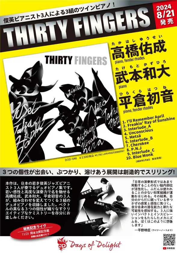 日本ジャズの新たなプラットフォームDays of Delight(ファウンダー&プロデューサー:平野暁臣)は、若い感性と高度な演奏力で名を馳せる3人の若きジャズピアニスト、高橋佑成、武本和大、平倉初音によるデュオピアノ集『Thirty Fingers』を2024年8月21日に発売します。