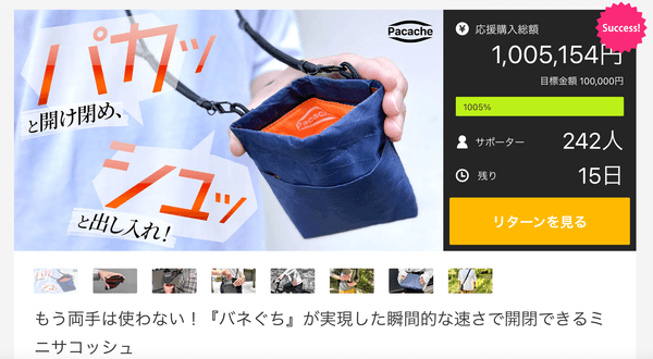 【目標達成率1,000%突破!】もう両手は使わない!『バネぐち』が実現した瞬間的な速さで開閉できるミニサコッシュ。Makuakeにてプロジェクト実施中!
