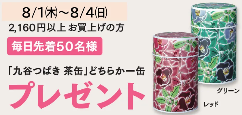 横浜元町店のオープンを記念し、2024年8月1日(木)~8月4日(日)は、2,160円以上お買い上げいただいたお客様を対象とし、1日先着50名様に素敵な茶缶をプレゼントします。