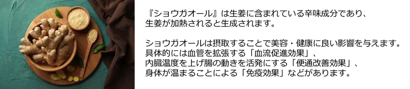 夏の冷えや便秘に悩む方に向けて、今回の調査を監修した医師の石原 新菜先生がおすすめするのは、通称“摂るサウナ”とも呼ばれる『ショウガオール』です。『ショウガオール』は、生姜を加熱させることで生成される成分で、「血流促進効果」や「便通改善効果」といった、サウナに似た美容・健康効果が期待できます。