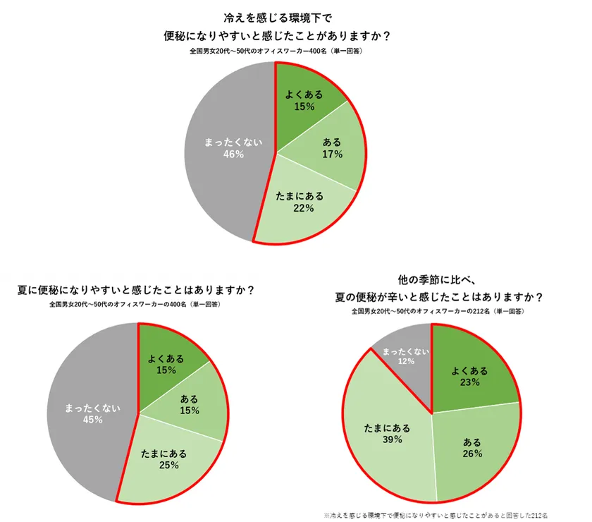 今回の調査で、“職場の夏冷え”を感じる方が多いこと、冷えにより“夏便秘”になりやすいと感じる方が多いことが明らかになりました。