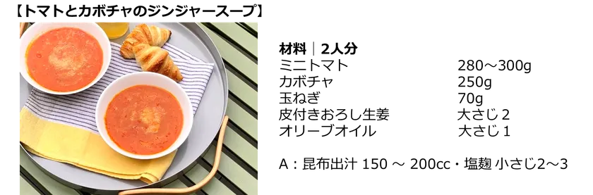 身体の内側から温めてくれる生姜と食物繊維たっぷりのトマトとカボチャ。そして、腸活効果のあるオリーブオイルを使用したスープで夏冷え・夏便秘対策にぴったりなメニューです。