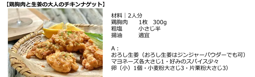 生姜の香りが楽しめる少し大人なチキンナゲット。夏バテ予防にオススメな鶏胸肉と温活・腸活効果のある生姜を使った夏にピッタリな一品です。手軽に作れるのでおかずにもおやつにもオススメです。