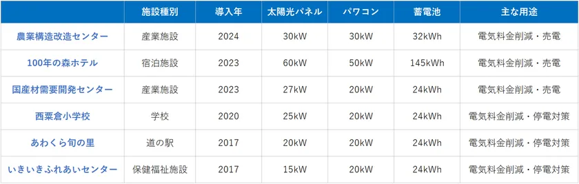 西粟倉村は「百年の森林構想」や「生きるを楽しむ」をビジョンとして、人にも環境にもやさしい持続可能な村づくりに取り組んでおります。2022年には環境省が公募する「脱炭素先行地域(第1回)」に採択され、2050年カーボンニュートラルを目指し、村全域における公共施設に太陽光発電設備・風力発電設備・蓄電池・EV充電設備の導入を進めております。当社蓄電システムは多様なラインナップと機能性を有しているため、各施設毎のニーズに沿った容量・機能を備えた製品を提供し、同村のエネルギー効率運用に貢献することができました。