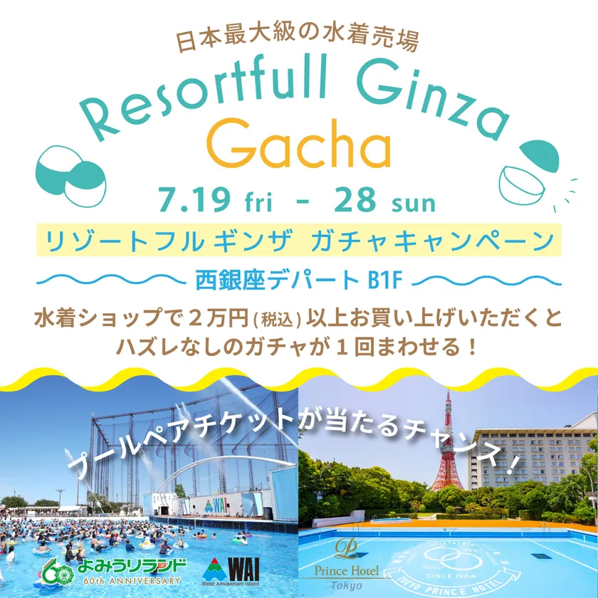 リゾートフル ギンザ内の3店舗いずれかで税込2万円以上お買い上げいただくと、よみうりランド「プールWAI」や東京プリンスホテル「ガーデンプール(デイプール)」のペアチケットの他、館内店舗のお得なクーポン等があたるハズレなしのガチャ抽選にご参加いただけます。