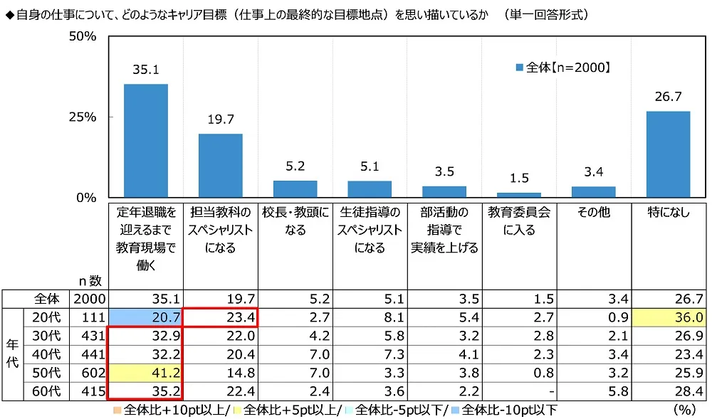全回答者(2,000名)に、自身の仕事について、どのようなキャリア目標(仕事上の最終的な目標地点)を思い描いているか聞いたところ、「定年退職を迎えるまで教育現場で働く」(35.1%)が最も高くなりました。定年までバリバリ現役として現場で働き続けたいと考えている人や、教員を自身の天職と捉え、最後まで全うしたいと考えている人が多いのではないでしょうか。次いで高くなったのは、「担当教科のスペシャリストになる」(19.7%)、「校長・教頭になる」(5.2%)、「生徒指導のスペシャリストになる」(5.1%)、「部活動の指導で実績を上げる」(3.5%)でした。