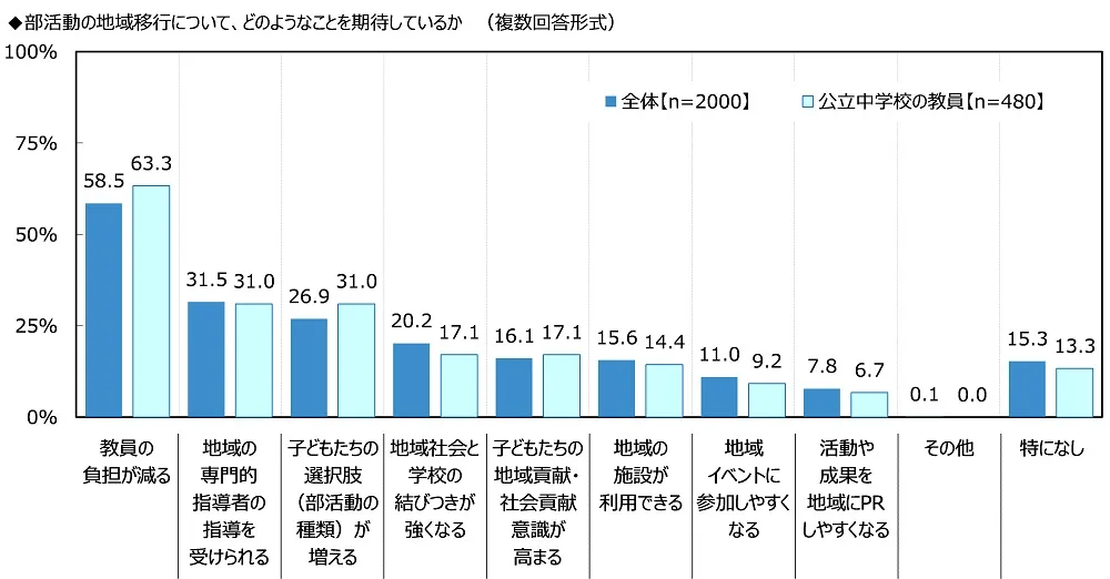 全回答者(2,000名)に、部活動の地域移行について、どのようなことを期待しているか聞いたところ、「教員の負担が減る」(58.5%)が突出して高くなりました。部活動の指導などに費やす時間が減り、教員の負担減少を図ることができると期待している人が多いようです。次いで高くなったのは、「地域の専門的指導者の指導を受けられる」(31.5%)、「子どもたちの選択肢(部活動の種類)が増える」(26.9%)でした。専門的な指導を受ける機会の創出や選択肢の増加など、子どもにとってのメリットを期待している人も多いことがわかりました。以降、「地域社会と学校の結びつきが強くなる」(20.2%)、「子どもたちの地域貢献・社会貢献意識が高まる」(16.1%)が続きました。