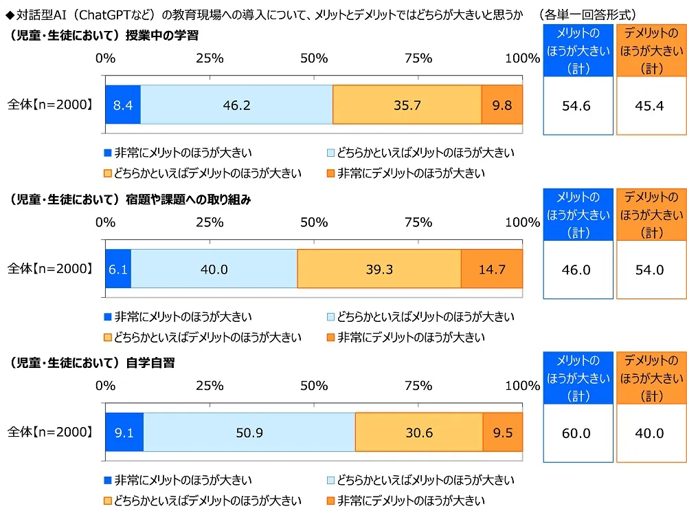 全回答者(2,000名)に、対話型AI(ChatGPTなど)の教育現場への導入について、メリットとデメリットではどちらが大きいと思うかをシーンごとに質問しました。