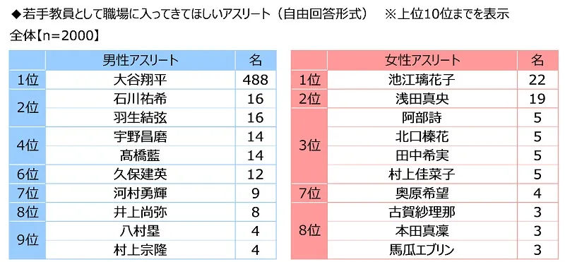 ・若手教員として職場に入ってきてほしいアスリート 男性アスリート1位は「大谷翔平さん」、女性アスリート1位は「池江璃花子さん」