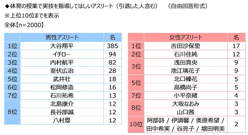 体育の授業で実技を指導してほしいアスリート(引退した人含む)を聞いたところ、男性アスリートでは1位「大谷翔平さん」(385名)、2位「イチローさん」(94名)、3位「内村航平さん」(82名)、4位「室伏広治さん」(28名)、5位「武井壮さん」(18名)となりました。