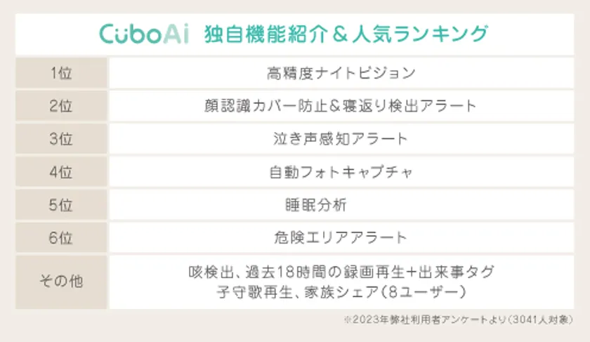 20万人以上(2024年当社調べ)のママパパに愛用されるCuboAiスマートベビーモニターは、「顔認識カバー防止&寝返り検出アラート」「高精度ナイトビジョン」「泣き声検知」「自動フォトキャプチャ」など多彩な機能を持っています。約3000人の利用者のみなさんにCuboAiの推し機能をうかがいました。