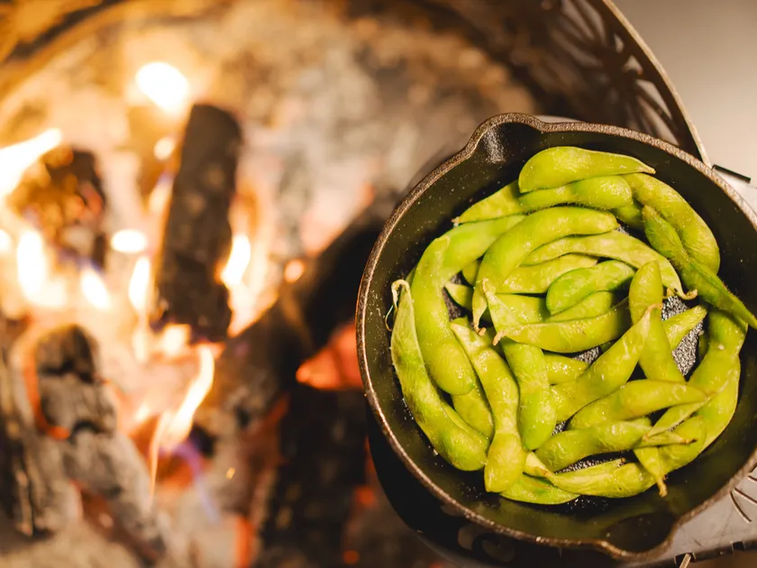 たき火で香る!鉄鍋“焼き枝豆”(やみつき塩味)