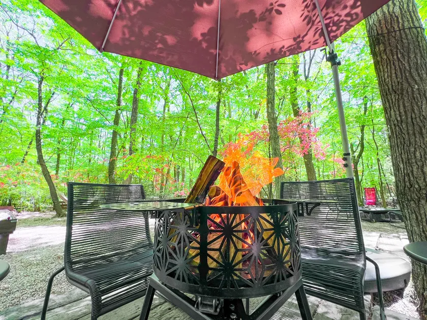 日中は森とたき火を楽しむおしゃれなカフェ