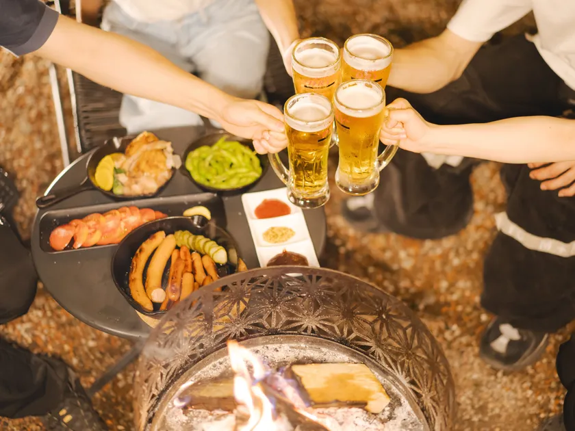生ビールや生ハイボールをはじめとしたアルコール類やソフトドリンクが飲み放題。お酒を飲めない人でも一緒に夜の時間を楽しめます。また、お店自慢のフードメニューも充実。たき火を使った鉄鍋スキレット料理はアツアツで、キャンプ気分も一層高まります。地元の新鮮な食材をふんだんに使用した美味しい料理をお楽しみいただけます。