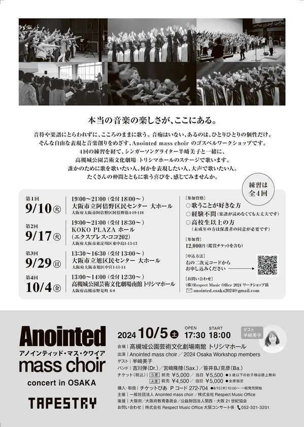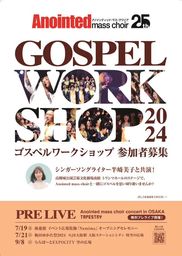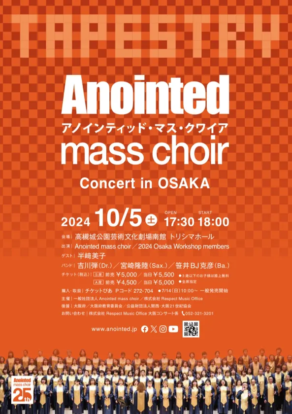 今年創立25周年を迎えたゴスペルグループ「一般社団法人Anointed mass choir(アノインティッド・マス・クワイア)」は、2024年10月5日(土)、高槻城公園芸術文化劇場南館 トリシマホールにて、コンサート「Anointed mass choir concert in OSAKA “TAPESTRY”」を開催いたします。