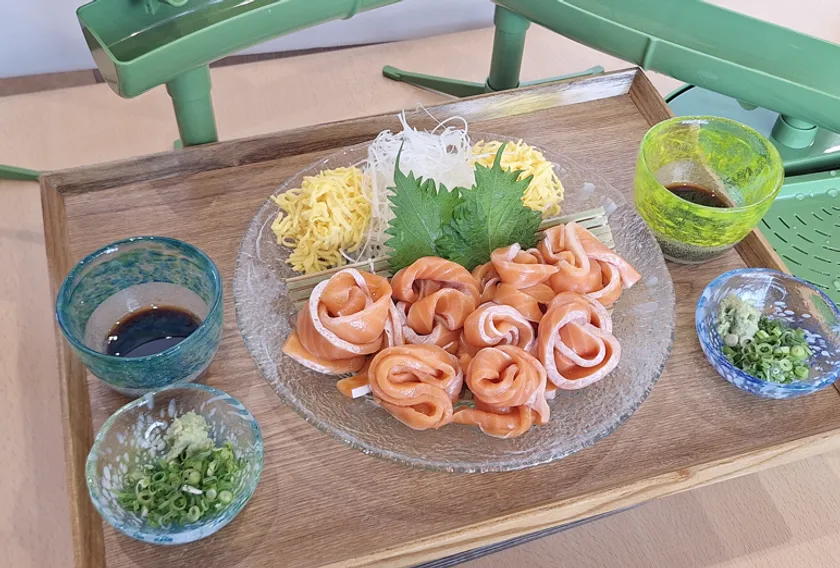 まるで流しそうめんのように流れてくるサーモンのお刺身をキャッチ!いくら醤油でお召し上がりいただきます。