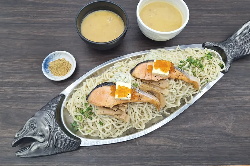 なんと約600g(大盛り2人前)のつけ麺が登場!北海道産の鮭の削り節を使った濃厚なつけだれと一緒にお召し上がりいただきます。