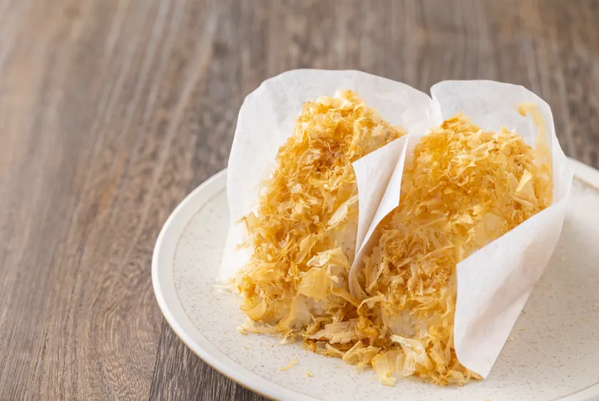 羽釜で炊き上げた熱々のお米を使ったおにぎりに鮭の削り節をまとわせ、香りから楽しんでいただくおにぎりです。お米は北海道産のななつぼしを使用しており、香り豊かな鮭節とも相性抜群です。