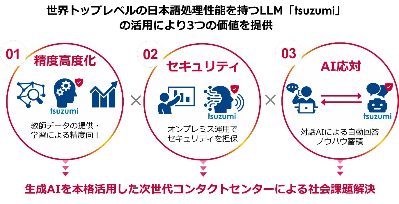 コンタクトセンターの業務効率化および顧客接点の高度化を目的に、NTT版大規模言語モデル「tsuzumi」を活用したセキュアなAIコンタクトセンターを開発します。