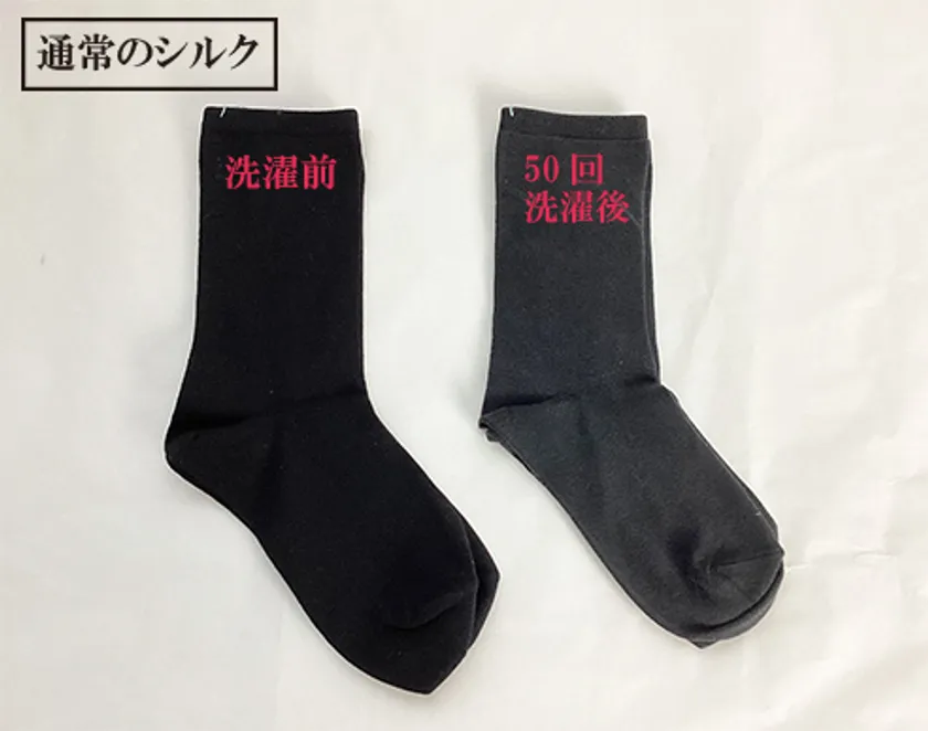 素材は天然シルク100%。家でも手軽に洗えるように特殊な加工をしていますが、一般的な洗えるシルクは出来上がった糸や生地の表面にウォッシャブル加工をしています。当社の製品は糸になる前に繊維のたんぱく分子を「分子改良」しているので、より耐久性が高く肌触りに優れていますが、糸の生産が少量なのでまだまだ製品としては少数です。