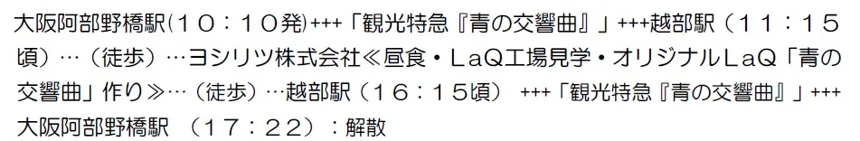 ※旅行代金には、近鉄運賃、特急料金、特別車両料金、弁当代、LaQ青の交響曲キット代、イベント費、添乗費および諸費用を含みます。