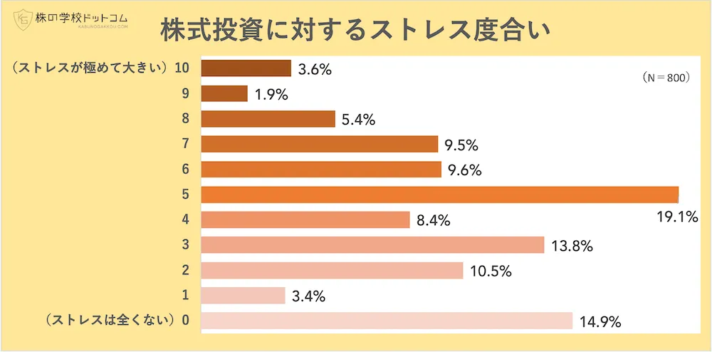 続いて、株式投資に対するストレスについて聞きました。「0(ストレスは全くない)」から「10(ストレスが極めて大きい)」までの数値でストレスの大きさを回答してもらったところ、ストレス度最高の「10(ストレスが極めて大きい)」を選んだ人は全体の3.6%でした。
