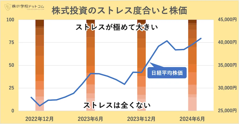 ストレス度合いについても、2022年12月からの推移を見てみます。株価の上昇とともにストレス度合いの高い人が減っている傾向は見て取れるものの、その変化はさほど大きなものにはなっていません。株式投資とは、株価が上がればストレスがなくなる、という単純なものではないということでしょう。
