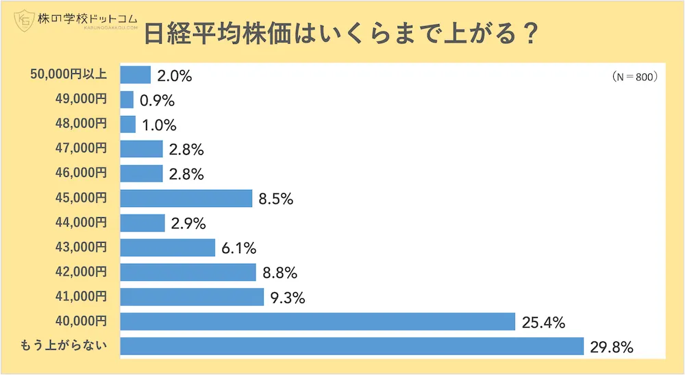 「日経平均株価は今年中にいくらまで上がると思いますか?」という質問に対しては、「もう上がらない」と答えた人が最多の29.8%でした。6月29日の日経平均株価は39,583円でしたが、「45,000円」以上を選択した人は合計で17.9%いました。