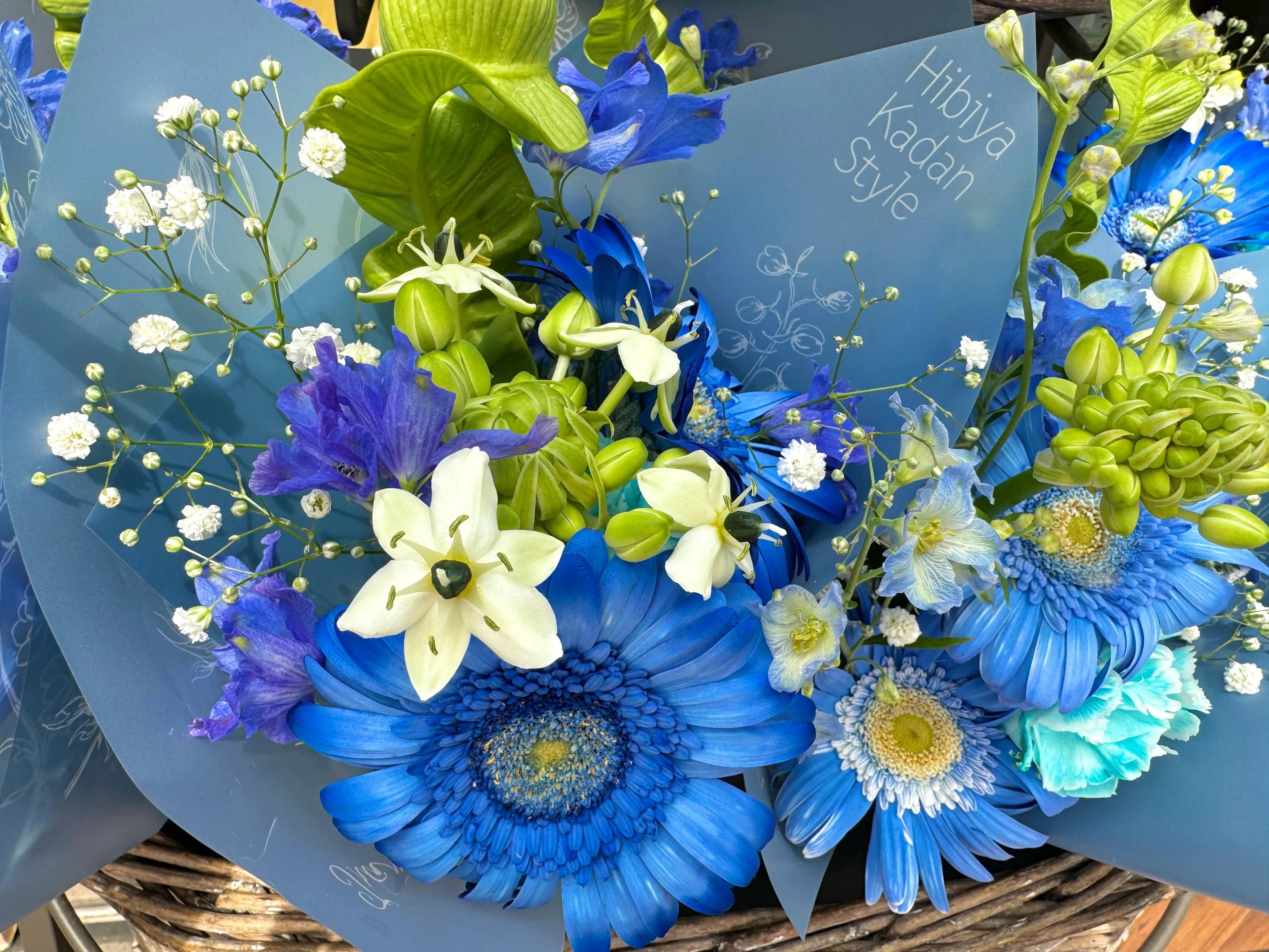 リニューアルオープン当日の店頭では、涼しげなブルー系の花々を集めた「アイランドブルーフェア」を開催。夏の海の青さを感じさせるデルフィニウムや青く染めたガーベラなどを束ねた「マリンブーケ」(税込1,650円)を、Hibiya-Kadan Style +F限定で販売します。新鮮な旬の花々とともに、お客様のご来店を心よりお待ちしております。