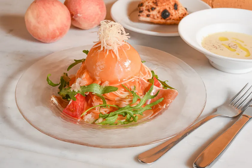 日本が世界に誇れるフルーツの代表格とも言える白桃。その白桃の相棒に選んだのは夏の野菜「フルーツトマト」。まさに黄金の組み合わせをマザームーンカフェでは、冷たいパスタでご用意しました。甘くて優しい味わいの白桃の自家製コンポートと、フルーツトマトを贅沢に使ったトマトソースの相性が抜群です。
