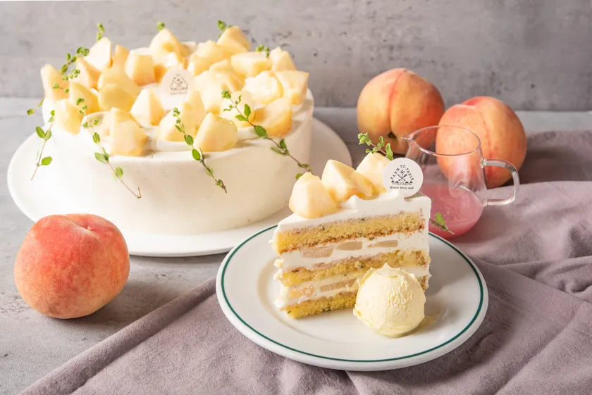 みずみずしい完熟の白桃をふんだんに飾り付けたレイヤーケーキ。兵庫県産の大葉を混ぜ込んで焼き上げた生地で、スライスした白桃とバニラを贅沢に使用したクリームをたっぷりはさみ、美しい断面に仕上げました。白桃の濃厚な甘い香りに、ほのかに香る大葉の風味が夏らしいアクセント。仕上げの白桃とライチのソースで爽やかな甘さとトロピカルな香りをプラスした、絶妙なハーモニーをお楽しみください。