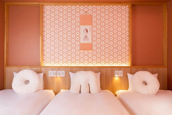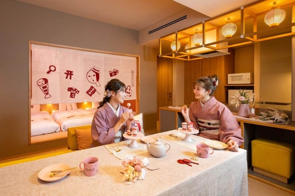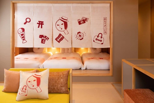客室の中心には、ロゴイラストの要素を散りばめた手染めののれんを設え、着物で過ごしてもテンションのあがるデザインに仕上げました。また、ルームウェアや、OMO・よーじやの形をしたオリジナルクッションを組み合わせて写真を撮るなど、旅の思い出を残せるフォトグッズを各所に詰め込んでいます。客室は、最大5名まで宿泊できるため、友人同士の旅行も、お部屋が離れることなく一緒に過ごせます。