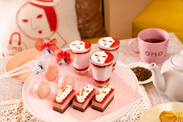 京都市内に展開する「よーじやカフェ」のパティシエが考案したスイーツを提供します。よーじやのロゴイラスト入りミニパフェ、イチゴとチョコのムースケーキ、ロリポップの3種です。通常はよーじやカフェでしか手に入らないよーじやのスイーツを、空間のデザインに合わせ、見た目が華やかでテンションのあがるメニューに仕立て、客室にて提供します。また、スイーツに合わせ和紅茶・苺ほうじ茶の2種のお茶を一緒にご用意。レトロかわいい客室でのオリジナルティータイムを過ごせます。