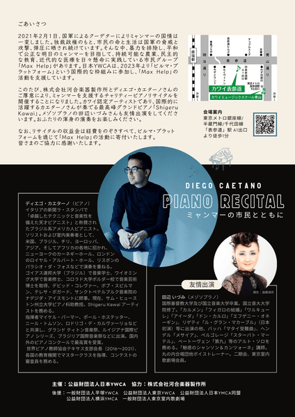 このたび、株式会社河合楽器製作所とディエゴ・カエターノさんのご厚意により、ミャンマーを支援するチャリティーピアノリサイタルを開催いたします。