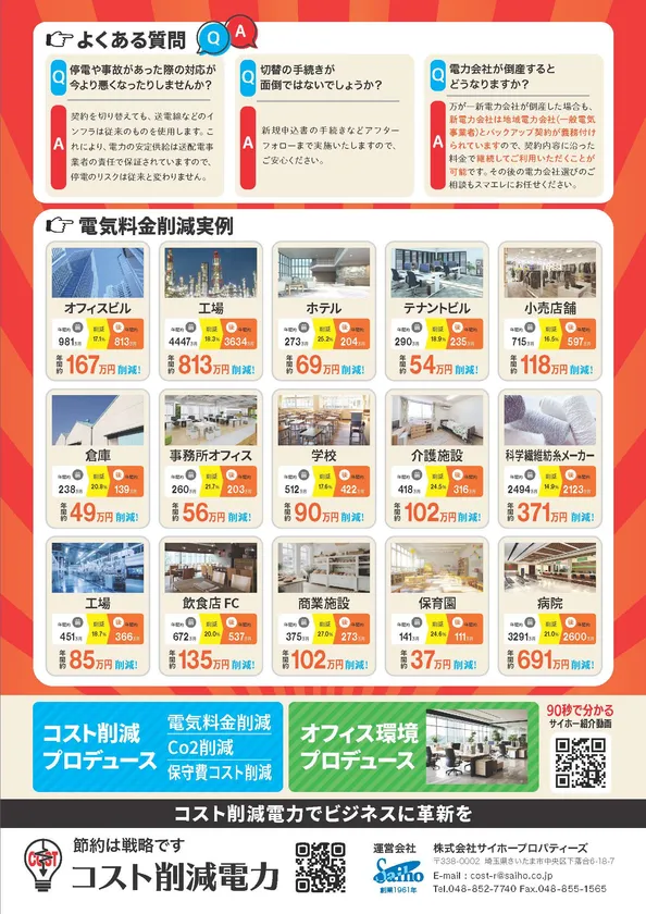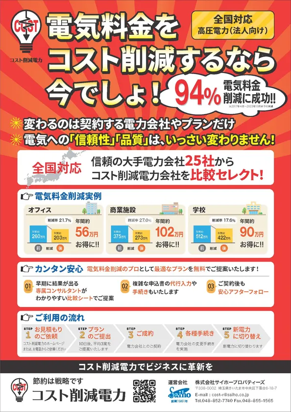 企業のコスト削減をプロデュースするサイホーホールディングス傘下の株式会社サイホープロパティーズ(本社:埼玉県さいたま市中央区、代表取締役:清野 光昭)は、2021年6月より地域の電力網をそのまま活用することで企業の電力利用料を削減することができる法人向けサービス「コスト削減電力」を刷新した、25社の大手電力会社から電力会社をセレクトできる、新しい電気料金削減の提案型サービスを提供開始します。