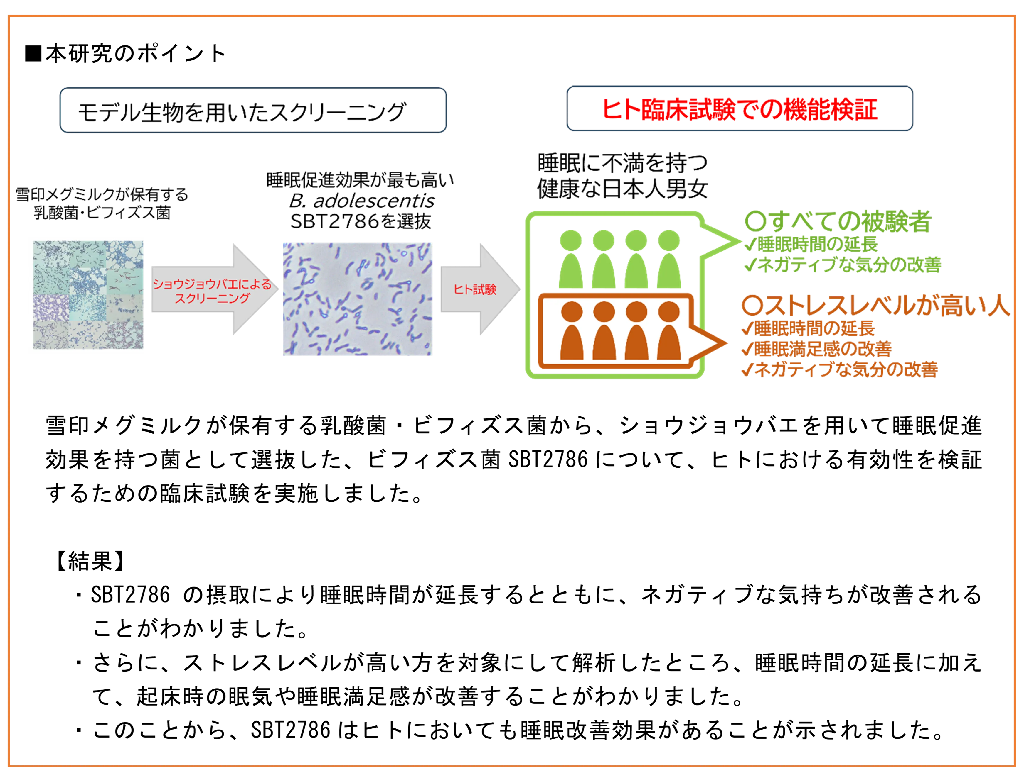 論文題名 ビフィズス菌SBT2786は比較的ストレスレベルの高い日本人成人の睡眠の質を改善する:プラセボ対照二重盲検ランダム化比較試験