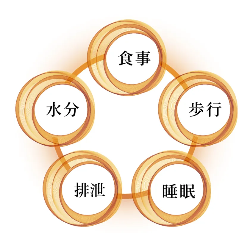 自立支援介護のケアでは、「水分摂取」「食事(常食)摂取」「規則正しい排泄」「歩行の機会」の4つが健康体をつくり出すためのケアの基本といわれております。イーケアでは、この4つに「睡眠の質」を含めた5つを基本ケアとして位置づけています。これら5つの要素は、高齢者の身体面・精神面・認知面に大きく影響を及ぼしますが、逆に基本ケアを確実に行うことでほとんどのADL(日常生活動作)問題は解決に向かうと言われています。