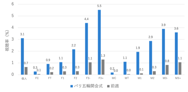 全ての性年代で前週の視聴率を大きく上回り、中でもF3+の視聴率が最も高く5.5%となりました。また、若年層(FT, F1, F2, MT, M1, M2)は前週時点では0.5%未満という非常に低い視聴率だったにも関わらず、今回1〜3%程度の視聴率となっており、オリンピックが幅広い年齢層に訴求できるコンテンツであることが伺えます。