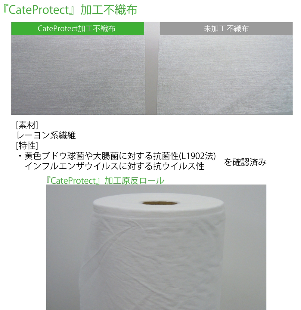 『CateProtect』は、インフルエンザをはじめ、多様なウイルスや菌に有効であることが、すでに研究データにより実証されています。プロテクティアは、その優れたウイルスや細菌に対する効果を幅広い製品に応用していただきたいという考えから、『CateProtect』を提携希望企業に技術(感染症対策部材)という形で提供します。第一段階として『CateProtect』を搭載した不織布形態の部材実用化に成功しました。