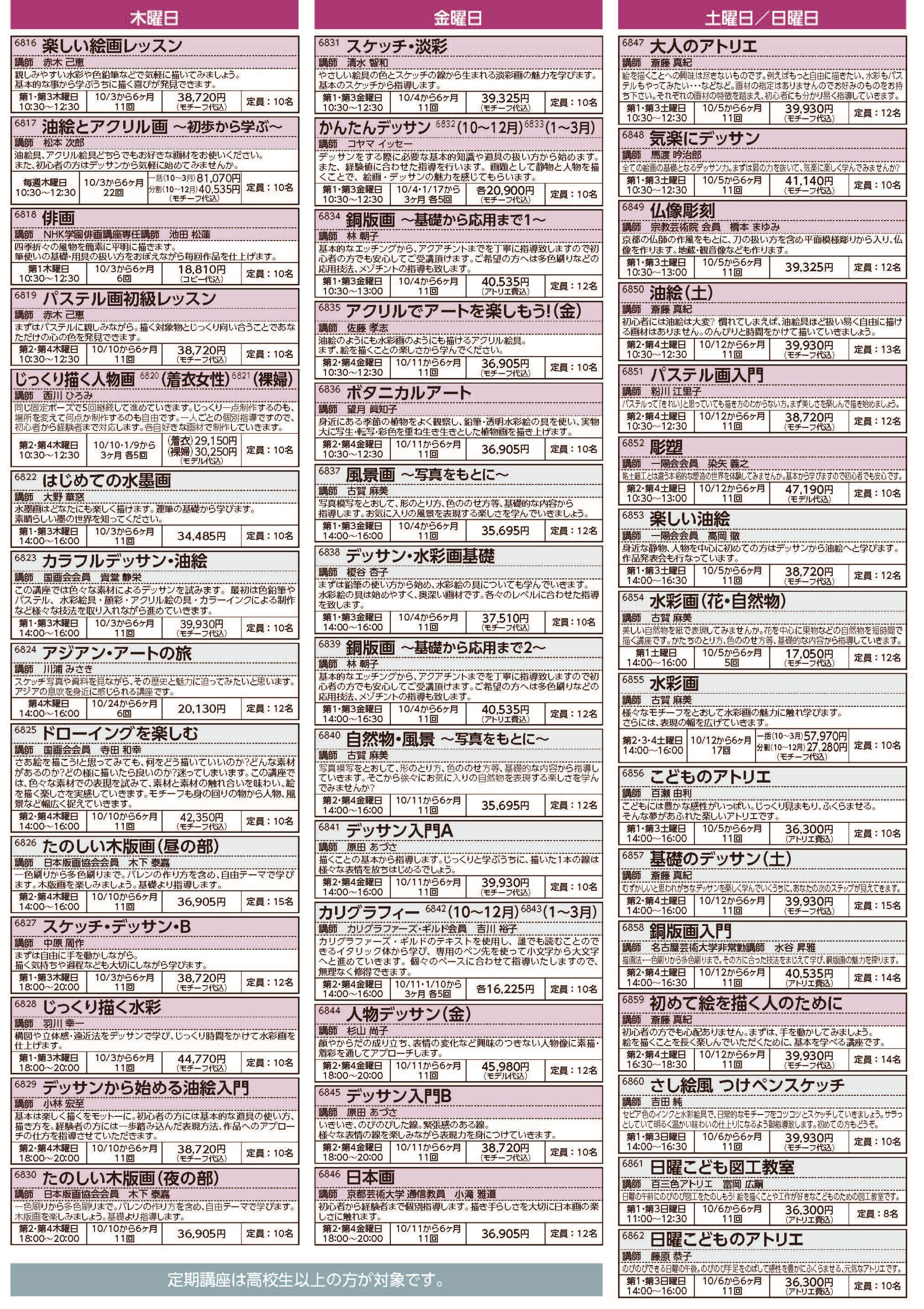 油絵、水彩、アクリル、デッサン、パステル、色鉛筆、銅版画、木版画、日本画など70以上の講座があり、興味のある講座がきっと見つかります。事前予約することにより、授業の見学もでき、カリキュラムの途中からも受講できます。