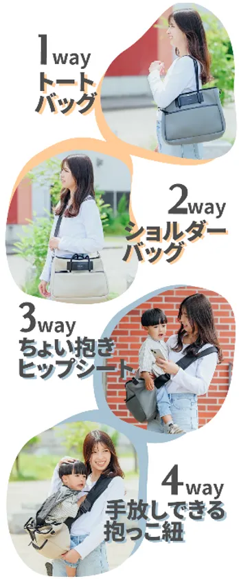この想いを形にするうえで、「子供も、ママも、楽しい」を大切にすることがトカイナカ地域に住むことの誇りや楽しさに繋がると考えています。そこで、「子育て中であっても、女性としての可愛さ(おしゃれ心)を常に持ち続けられる」をキーワードに、(1)トートバッグ、(2)ショルダーバッグ、(3)ちょい抱きヒップシート、(4)手放しできる抱っこ紐の4wayで活用できるバッグ抱っこ紐が誕生しました。