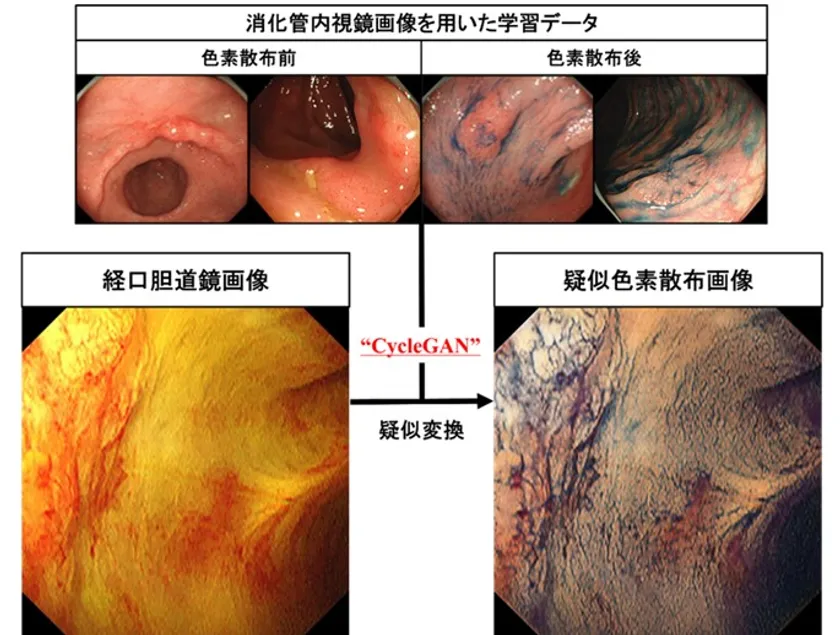 図2:色素散布前後の消化管内視鏡画像を学習データとして使用し、経口胆道鏡画像をCycle GANというAIを用いた画像スタイル変換技術よって疑似色素散布画像へと変換することに成功した。