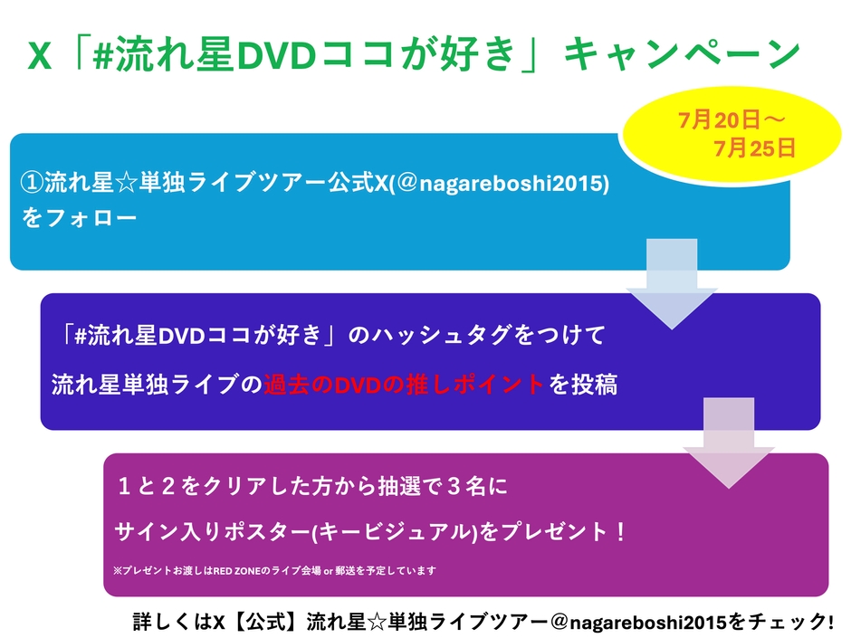 「#流れ星DVDココが好き」のハッシュタグをつけて流れ星単独ライブの過去のDVDの推しポイントを投稿した方の中から、抽選で3名様にサイン入りポスター(キービジュアル)をプレゼントするキャンペーンをX(旧Twitter)にて開催!